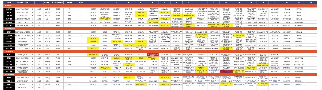 Palace have their players on the horizontal axis, which is the usual way. (Note that the names are upended so you have to turn the programme 90° to read them, which is only the start of the ballache.) At that point in the season, Palace had used ~31 players. The more players you use, the more you have to flatten the typeface. Oldham will use 40+ players this season, as we did last season. Once you squeeze all of them and their data in, you can’t read the names or find the data. What do programme editors have against their readers? Why are they making them work so hard?