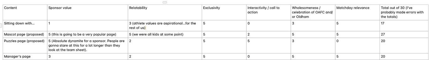My idea is that we could all – me, people in the club, select punters – use this framework to evaluate our editorial content, perhaps adding criteria as we go along. The questions that flow from it give us the chance to talk about improvements. These could be small scale: how can we up the sponsor value of “Sitting down with…”? Is the manager page really worth a 5 for “Exclusivity” if it’s a transcript of an interview with the manager we’ve already put out on the website?